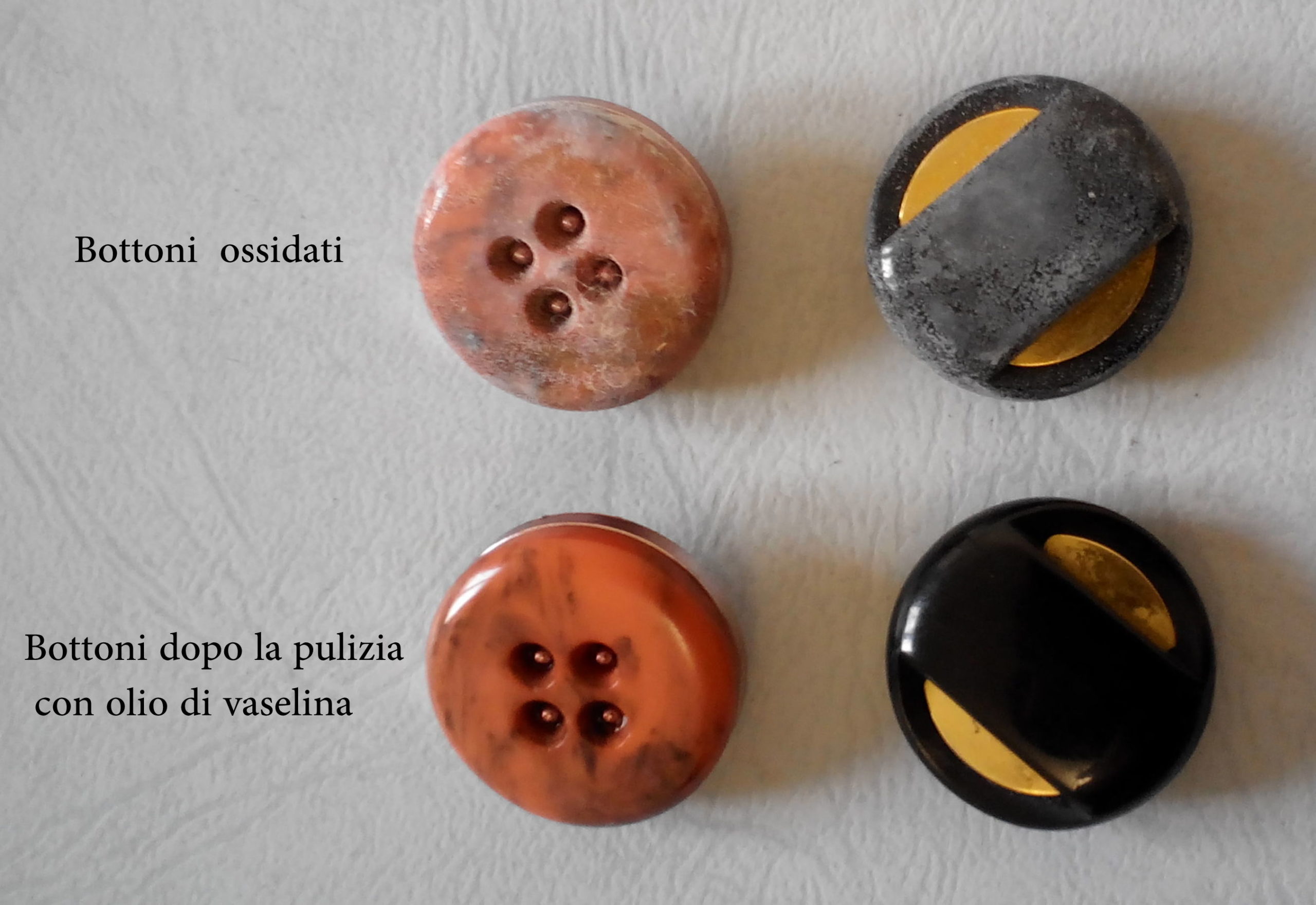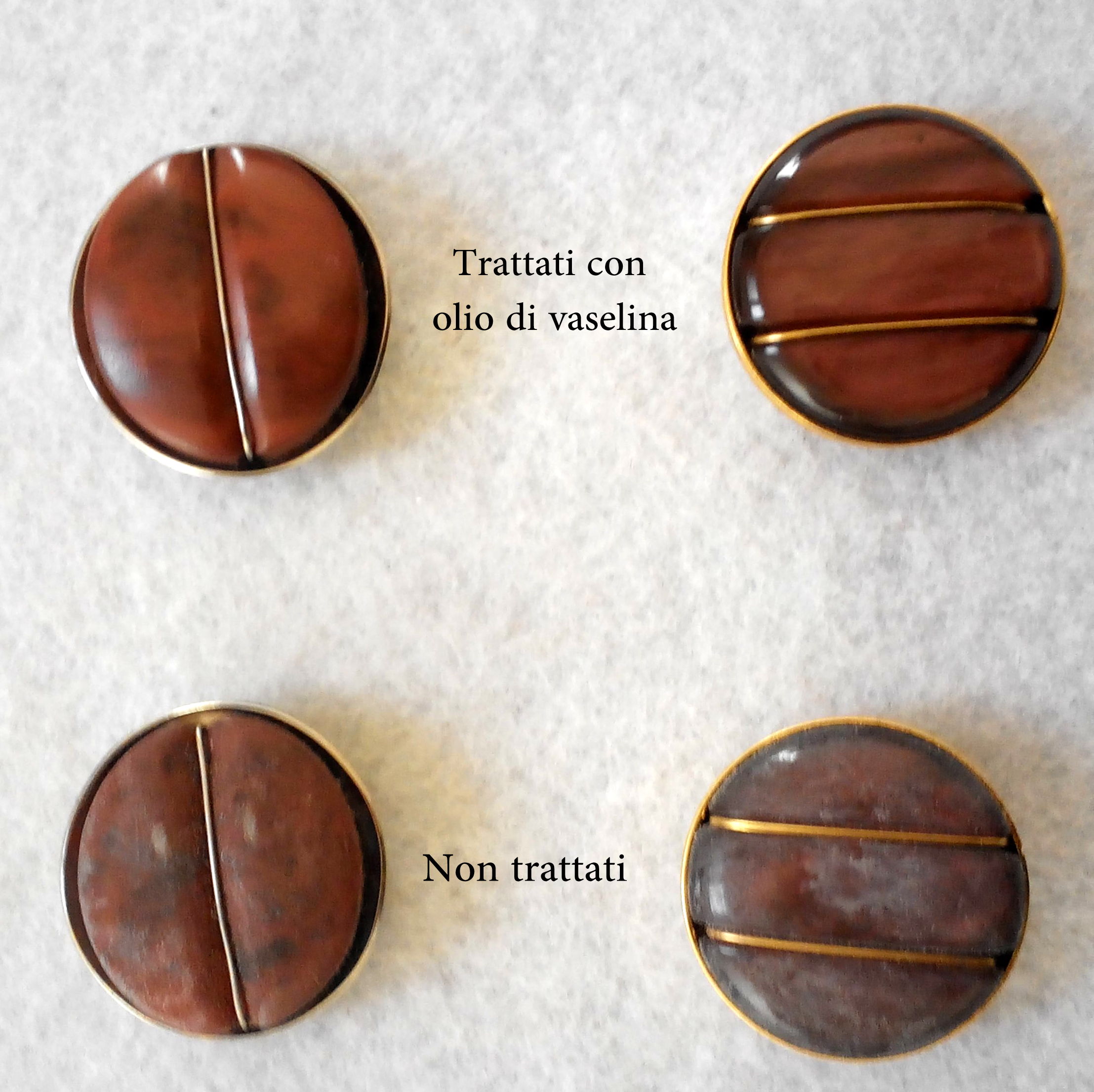 Alcuni bottoni di questo lotto presentano segni di ossidazione della resina rendendo opaco il bottone, cosi come si può vedere nelle foto sottostanti. Li abbiamo lasciati cosi di proposito a testimonianza degli anni che hanno. Se trattati con olio di vaselina o altro prodotto evitando lubrificanti aggressivi, ritorneranno come nuovi (vedi foto)
