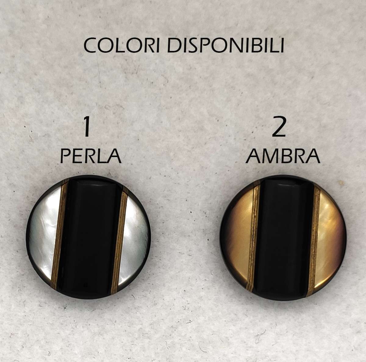 Questo bel Bottone è formato da un mix di resine alla vista lucente e sfumata. La parte frontale presenta due infossature lineari, ornate da sei lamelle di ottone inserite di taglio tre a tre che separano la parte chiara dalla parte scura della resina. Il foro di cucitura resta nascosto sul retro