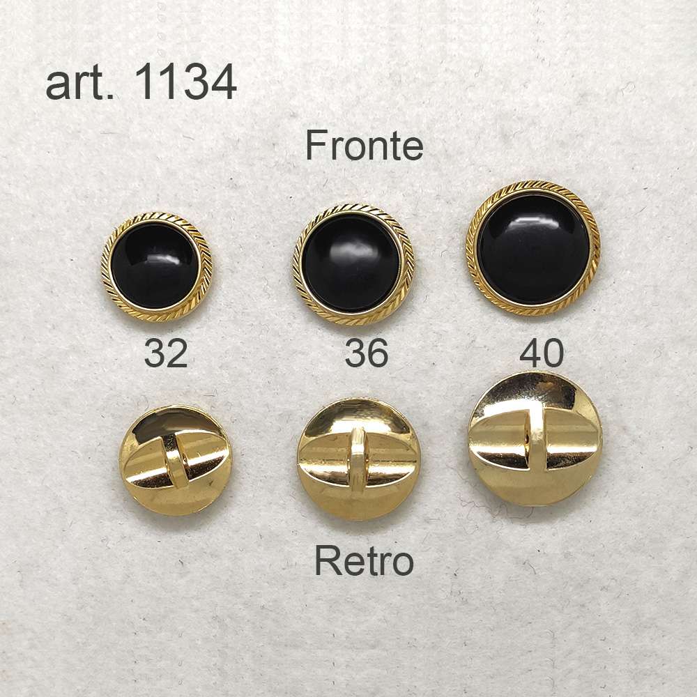 Questo bel bottone Bottone è realizzato con resina monocolore per la parte frontale e il fondo in ABS, (tipo di resina ideale per la simulazione di metalli cromati, in questo caso color oro). La parte superiore si presenta con un design semplice per la pasticca centrale che è monocolore per il bottone nero e appena appena sfumata quello testa di moro. Intorno alla pasticca il fondo in abs sborda di mm. 1,5 ed è abbellito da una zigrinatura che brilla alla luce