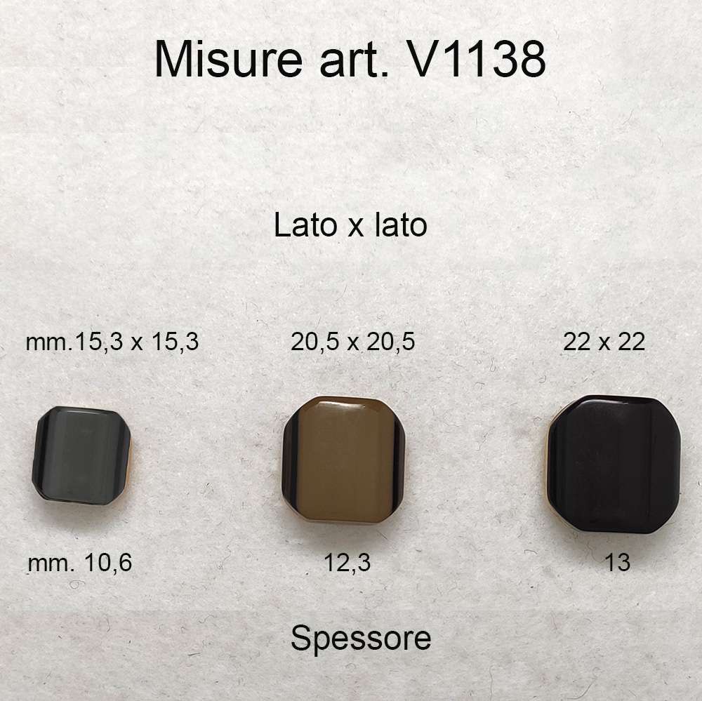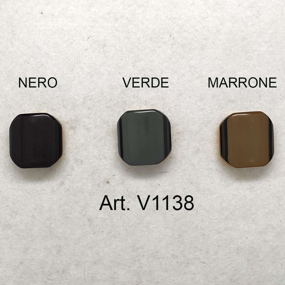 Questo particolare bottone è assemblato con due tipi di resine. Un tipo di resina in ABS, tipico materiale adatto per la riproduzione dell’effetto metallo cromato sia di color oro, argento o acciaio inox e molto leggero. L’altro tipo di resina forma una unica pasticca monocolore per il bottone nero e più strati colorati per i bottoni marroni e verdi. Tutti i bottoni hanno la base in abs di un bel colore oro