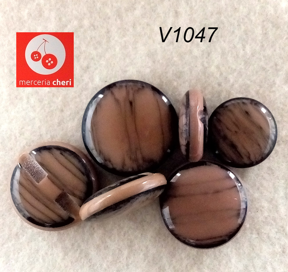 Bottone in resina dei primi anni 70- Questi bottoni sono stati nel nostro magazzino per un quarantennio chiusi nella loro scatola dove il tempo ha attivato la fase di ossidazione del materiale. Nonostante tutto dopo un’accurata pulizia, sono tornati all’antico splendore. La resina color cipria è abbellita da striature e cerchiatura di colore nero, rendendo alla vista, il bottone, simile al marmo.