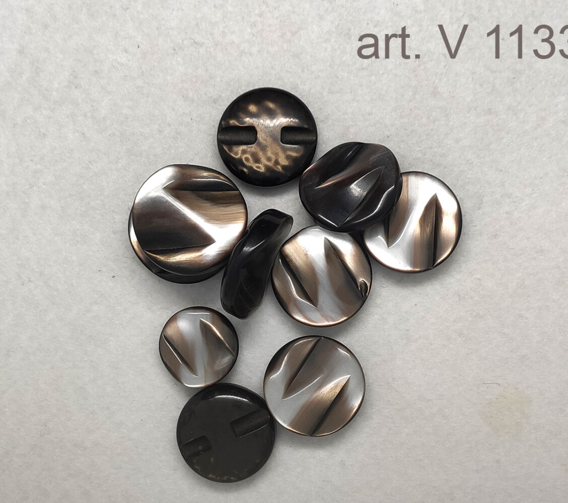 Bottone in resina con particolare motivo a rilievo a formare una zeta con sfumatura che va dal marrone al grigio perlato. Il motivo a rilievo rende questo bottone particolarmente luminoso.