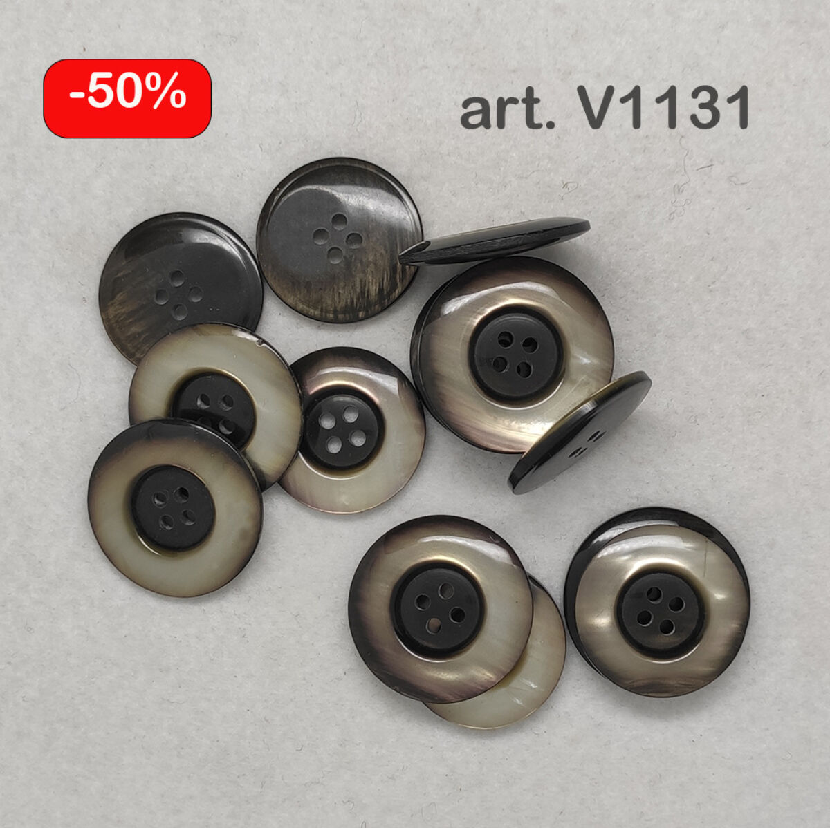 art V1131. Bottone a quattro fori piatto. Unico blocco di resina forma questo bottone piatto a quattro fori con riflessi tra il grigio e l’ambra con effetto madreperla.