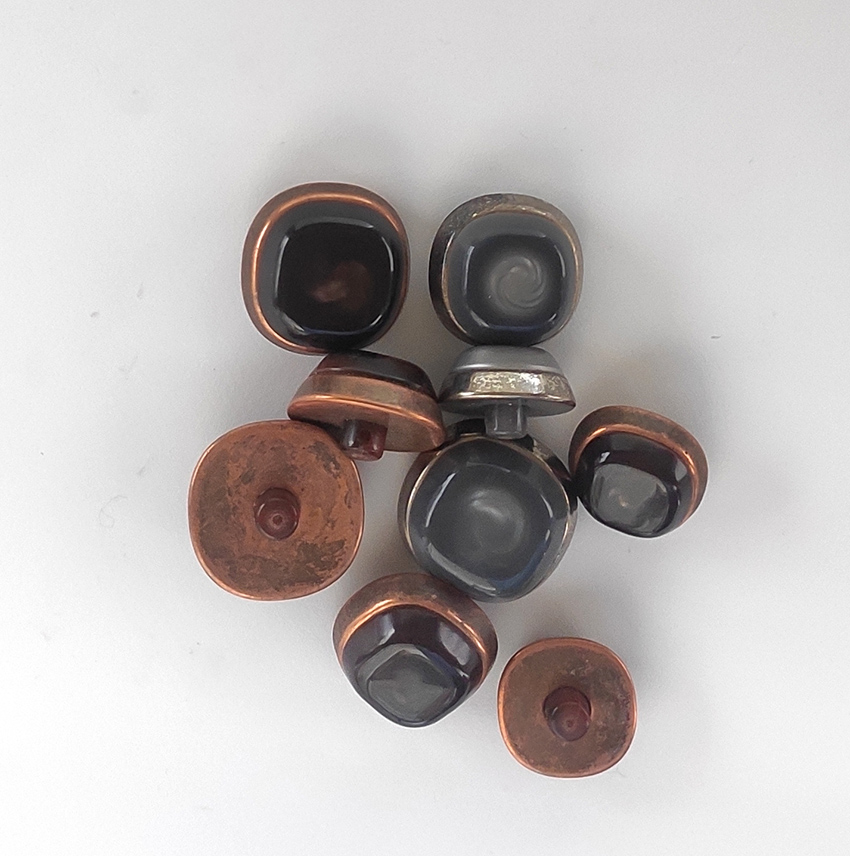 Bottone vintage dal design tipico degli anni 70 dalla forma tozza e spessore importante (circa mm 14 compreso il gambo di cucitura). Il bottone è assemblato da tre parti. La parte frontale è una miscela di resine colorate che rendono in bottone lucente con striature e sfumature in tinta. La parte posteriore è formata da una plastica dura rivestita da una sottile lamina di lega metallica all’aspetto con uno stato di ossidazione.