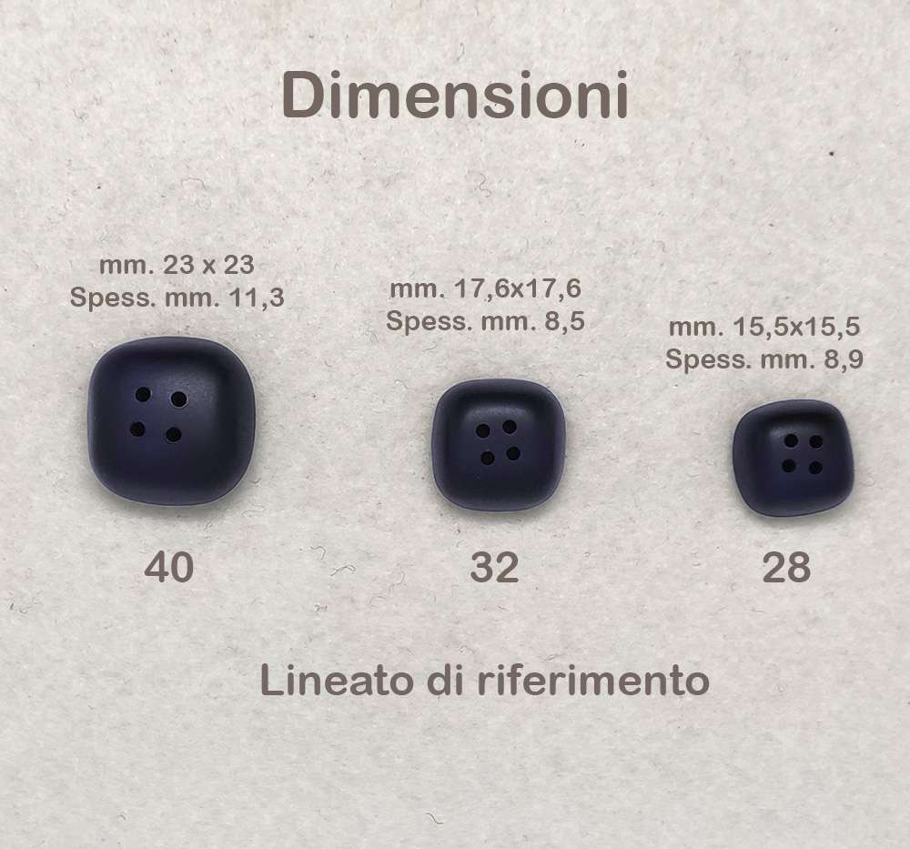 Bottone interamente in resina a quattro fori di cucitura dalla forma tozza per via del suo spessore. La resina di questo bottone interamente di colore blu e semplicemente senza sfumature o riflessi. Il bottone rimane semi opaco