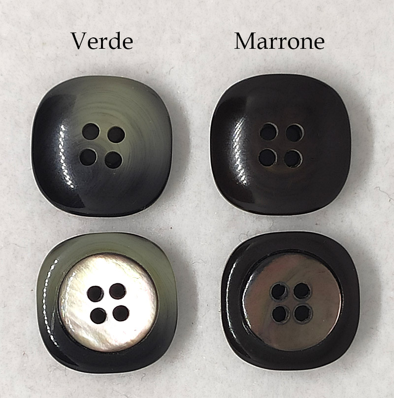Bottone vintage di fine anni settanta assemblato con resina marrone o verde per quanto riguarda la base mentre nella parte anteriore c’è una bella pastiglia di madre perla tahiti con i quattro fori di cucitura. Il bottone si presenta alla vista pulito e lineare dal design semplice