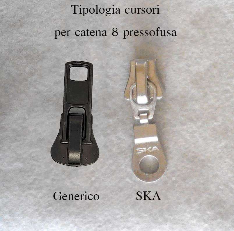 - Il cursore può essere indifferentemente di marca SKA, YKK, o similare generico avente stesse caratteristiche e compatibilità. Cambia solo il tiretto e/o la scocca esterna come da foto di riferimento