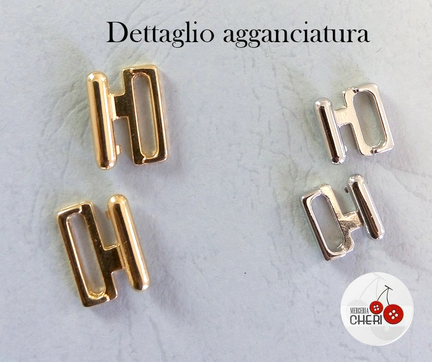 Questo prodotto è adatto a sostituire i ganci usurati o rotti di reggiseni e costumi da bagno. Grazie alla lega metallica laminata color oro o color argento si adatta specialmente a reggiseni con applicazioni di pailelttes, perline o altri abbellimenti metallici o di altro genere.