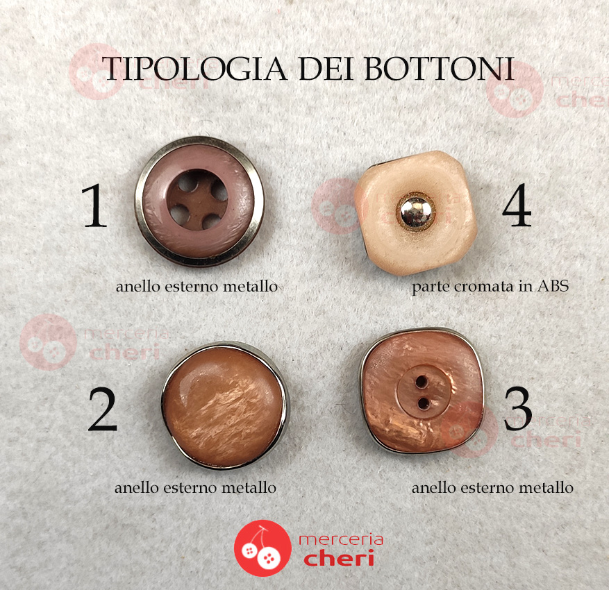 1 – Bottone rosa antico con anello esterno in lega metallica buco centrale con vista sui 4 fori di cucitura