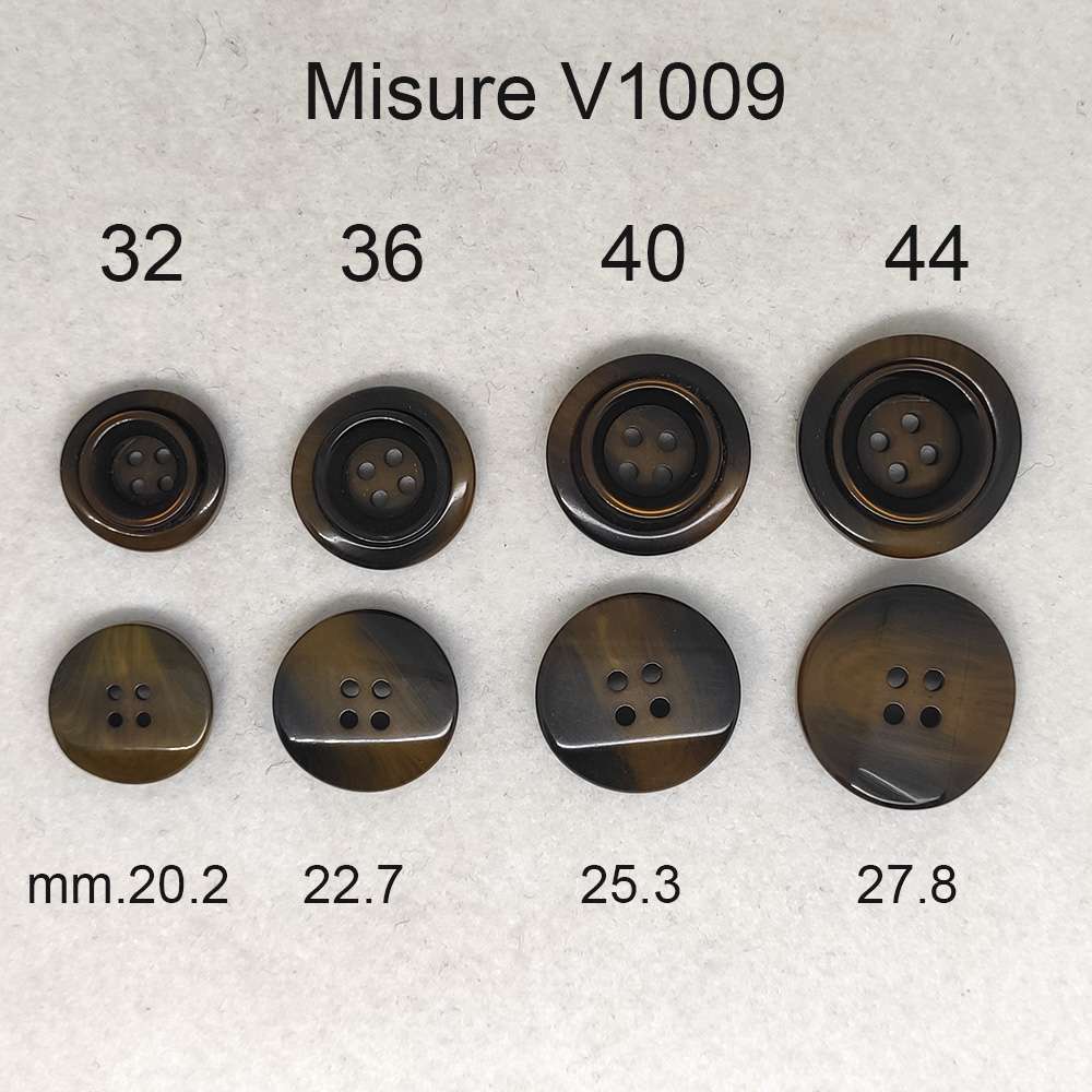 Vintage – Bottone a quattro fori formato da due parti di resina. La base è smussata su due lati mentre la parte superiore è caratterizzata da un anello (sempre in resina)incollato alla base. Le svasature rendono alla vista una forma ovale di questo bottone mentre nella realtà è un tondo perfetto. Disponibile nei lineati n° 32 – 36 – 40 – 44